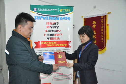 自11月29日起,陜西省西安市不動(dòng)產(chǎn)登記服務(wù)中心正式受理群眾的不動(dòng)產(chǎn)權(quán)證書郵寄業(yè)務(wù),群眾在辦理二手房交易、房屋抵押注銷、權(quán)屬登記等業(yè)務(wù)時(shí)可提出郵寄服務(wù)申請(qǐng),證書制作完成后可由EMS送達(dá)。這是西安市郵政寄遞事業(yè)部切入政府便民惠民工作、實(shí)現(xiàn)郵政便民服務(wù)的又一次拓展。圖為西安市不動(dòng)產(chǎn)登記服務(wù)中心的工作人員將第一件要郵寄的證書交到EMS工作人員手中。 □張雪珂 攝影報(bào)道