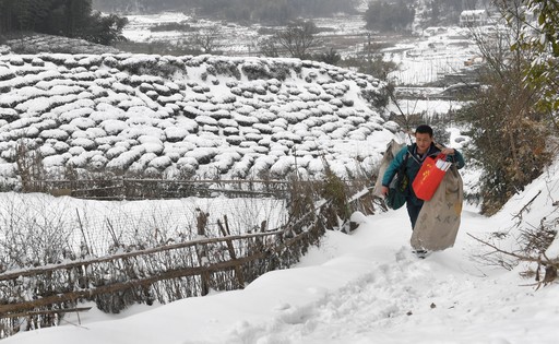 連日來(lái),地處大別山區(qū)的安徽省六安市金寨縣普降暴雪,通村山路被冰雪覆蓋,車(chē)輛難以通行。金寨縣張沖鄉(xiāng)郵政所的投遞員谷明洲改用肩挑手提郵件,步行數(shù)十里山路,及時(shí)為群眾投送郵件。圖為金寨縣張沖鄉(xiāng)郵政所投遞員谷明洲踏著被冰雪覆蓋的山路為群眾送郵件。