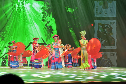 以郵票為背景,云南少數民族群眾登上舞臺。毛詠良 攝