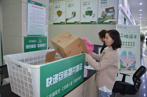 截至4月底,江蘇省東臺市郵政分公司日均回收快遞包裹箱約85個。4月22日,在第50個世界地球日,東臺市分公司因地制宜在32個郵政網(wǎng)點設(shè)置快遞包裝物共享站,啟動快遞包裝物循環(huán)利用工作,旨在推動綠色郵政建設(shè),切實踐行綠色發(fā)展理念。圖為在東亭路支局領(lǐng)取包裹的客戶將包裝箱投入共享站。 □單國勝 攝影報道