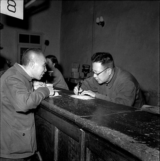 1958年4月,北京東四郵電局,在郵局工作了30多年的于鴻澤(圖右)積極為顧客填寫單據。工人日報 杜治 攝