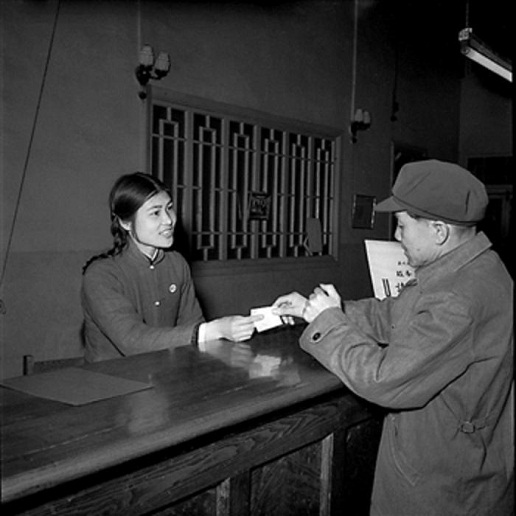 1958年4月,北京東四郵電局,營業員廉旻(圖左)主動向顧客介紹業務。當年,東四郵電局涌現出了常秀珍、沈秀敏、章秀敏、喬秀蘭和廉旻優秀服務群體,人稱“四秀一廉”。 工人日報 杜治 攝