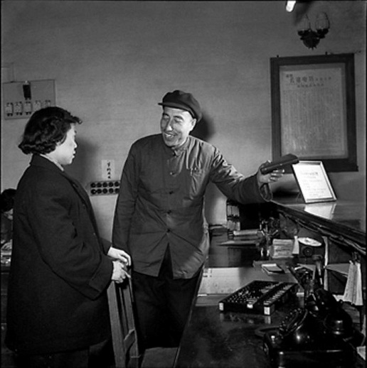 1958年4月,北京市郵局東城區局長兼黨總支書記劉桂馨(右),在東四郵電局指導營業員工作。工人日報 杜治 攝