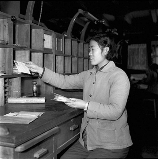 1959年,全國群英會代表、北京市東四郵電局投遞員羅淑珍投遞前在做準備工作。工人日報 王光祿 攝