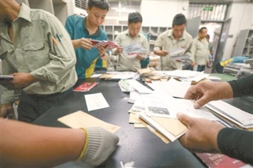 5月31日上午8時,北新橋投遞部的郵遞員在處理完包裹后又開始分揀信件。