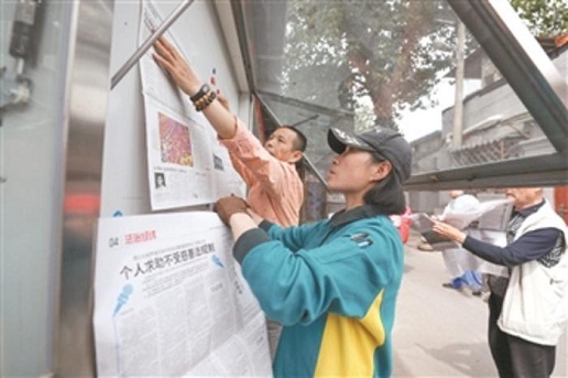 5月8日,劉小梅幫助社區志愿者在第一時間更換閱報欄的報紙。