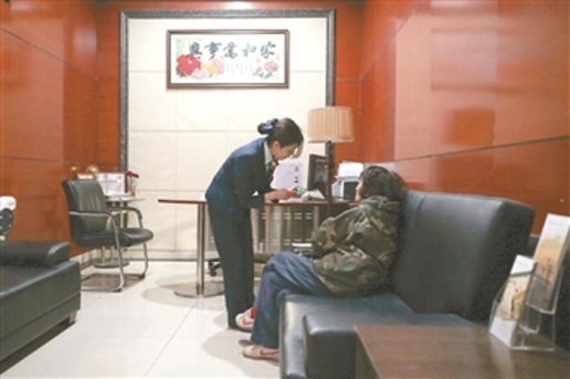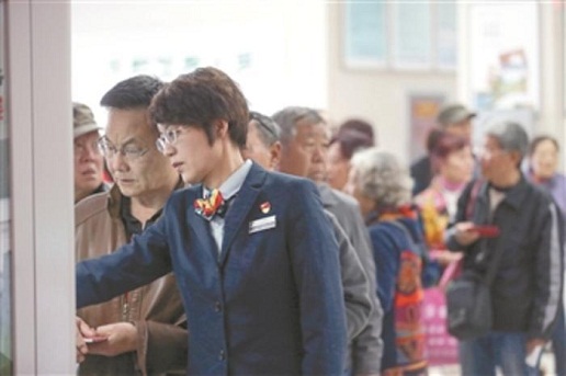 在自動存取款機前,排了十多位老人,樊潔先讓在后面排隊的老人到休息區的椅子上休息一下,再一個個幫助存取錢的老人辦理業務。有的老人聽不大清楚,她就湊近耳朵不厭其煩地一字一句地告訴他們,當天上午,樊潔在自動存取款機前站著忙活了兩個多小時?!皩ξ覀儬I業廳的工作人員來說,要求來有迎聲,問有答聲,走有送聲,唱收唱付聲。只要用情用心服務,就沒有辦不成的事。”她說這是東四郵局的傳統。