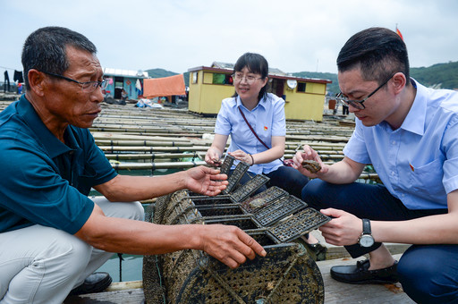 今年鮑魚(yú)喜迎豐收,養(yǎng)殖戶正津津樂(lè)道地向信貸員介紹鮑魚(yú)的喜人長(zhǎng)勢(shì)。