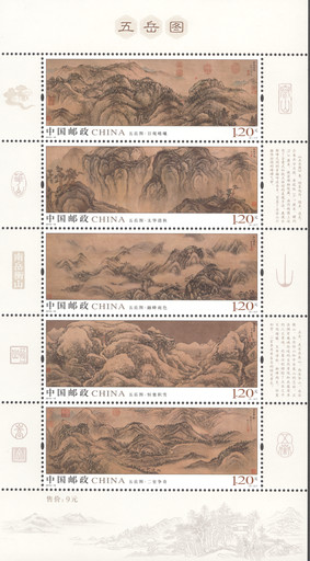 據王虎鳴介紹,郵票是一種精微的藝術形式,在放大數倍的情況下其圖案的清晰度也要經得住考驗,因此在修圖時,有時甚至要將原圖放大數倍再去精修。還有一個難度在于顏色還原,很多古畫歷經千年以上,有的經歷過水泡火燒,有的還有殘缺折痕,這就要求設計者從對古畫的理解及大眾的接受程度出發,一一撫平古畫之“傷”,還古畫一個“人生若只如初見”。此次設計《五岳圖》郵票,王虎鳴在設計上力求簡約大氣,主圖采用了古樸厚重的色調,整體風格呈現一派清新雅致。