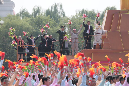 10月1日,在國慶70周年群眾游行活動中,其美多吉在“凝心鑄魂”方陣主題彩車上接受檢閱。《工人日報》記者 王偉偉 攝