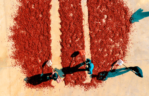 除了銀杏,辣椒市場也給郵政業務拓展帶來了新的機遇。這不,紅火的晾曬場上也有綠衣人幫扶的身影。