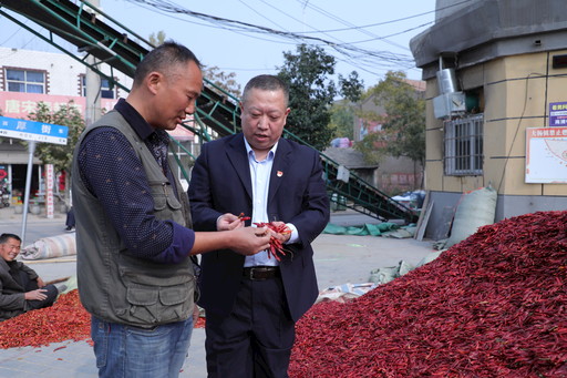 牛志勇(右)在農村走訪調研,與辣椒收購大戶交流,了解客戶金融需求。