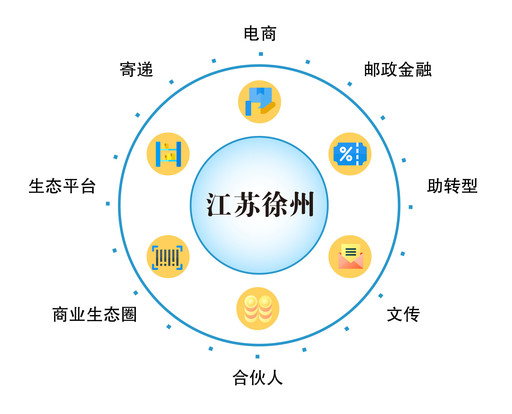 2018年10月,徐州市分公司在中心局舊處理場地建成了一個為入駐企業和個人提供創業指導、培訓交流、快遞物流、金融扶持、文創設計等服務的云郵基地。在云郵基地,政府通過整合資源,提供包括宣傳、公司注冊、政策補貼、法律咨詢、跨境資源庫整合等服務以及相應政策的支持。徐州郵政負責基地的運營,牽頭基地對外協調和內部管控工作,并為客戶提供金融、寄遞、文傳、電商等綜合服務。第三方公司提供代運營、美工、攝影、客服等專業服務。