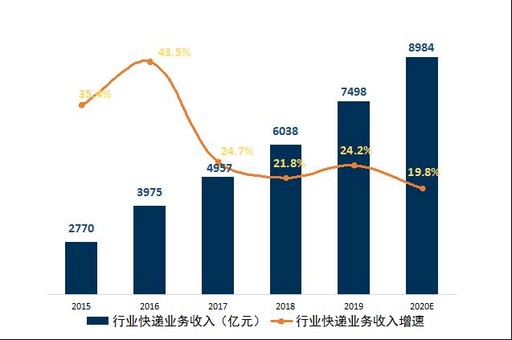 快遞行業(yè)繼續(xù)保持較高增速。2019年,全國快遞服務(wù)企業(yè)業(yè)務(wù)量累計(jì)完成635億件,同比增長25.3%,業(yè)務(wù)收入累計(jì)完成7498億元,同比增長24.2%。經(jīng)測(cè)算,預(yù)計(jì)2020年快遞行業(yè)業(yè)務(wù)量約為771億件,增速為21.3%;業(yè)務(wù)收入約為8984億元,增速為19.8%。(見圖1、圖2)