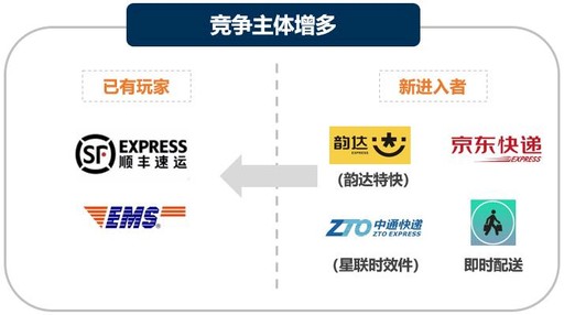 參與主體增多。京東開放個(gè)人寄件服務(wù),通達(dá)系打造直營標(biāo)快品牌,此外,即時(shí)配送強(qiáng)勢(shì)沖擊同城時(shí)效快遞,既有競爭格局面臨更多變數(shù)。(見圖3)