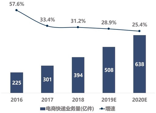 保持高位增長。2019年1月至11月,全國實(shí)物商品網(wǎng)上零售額為8.5萬億元,同比增長19.5%,增速進(jìn)一步放緩。結(jié)合申萬宏源證券預(yù)測(cè)結(jié)果,2020年,國內(nèi)電商快遞業(yè)務(wù)量增速將在25%左右。(見圖4)