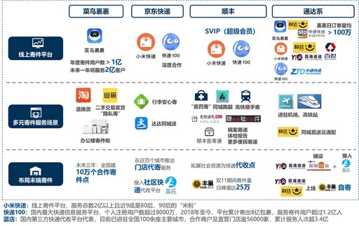 爭奪個(gè)人寄件市場,拓展業(yè)務(wù)來源。加快布局線上線下個(gè)人寄件流量入口,快遞企業(yè)紛紛接入菜鳥裹裹、小米快遞等第三方線上寄件平臺(tái),并通過官方在線寄件平臺(tái)發(fā)力會(huì)員營銷;同時(shí),不斷拓展末端自有服務(wù)網(wǎng)點(diǎn)、社會(huì)門店(代寄)、線下快遞代收平臺(tái)、智能快遞柜等寄件接口。圍繞個(gè)人寄件需求布局多元服務(wù)場景,菜鳥裹裹從退換貨延伸到辦公、二手交易等寄件場景,快遞公司圍繞出行、本地生活、就醫(yī)等場景推出全新寄件產(chǎn)品。(見圖6)