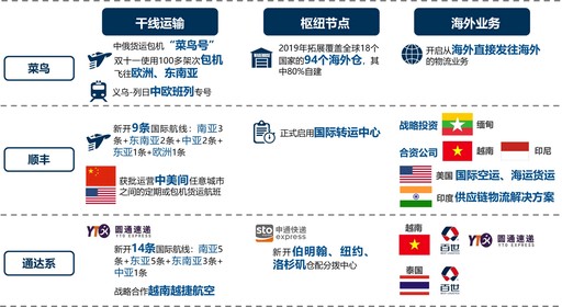 加碼跨境、拓展海外,搶抓國際化機(jī)遇。圍繞周邊國家持續(xù)升級(jí)跨境網(wǎng)絡(luò)能力,以開通國際航線、貨運(yùn)包機(jī)、搭載中歐班列等方式,加強(qiáng)跨境干線運(yùn)輸能力,并加大以海外倉為主的境外樞紐節(jié)點(diǎn)建設(shè)。通過“資本運(yùn)作+自建+加盟”方式,聚焦東南亞地區(qū)加速拓展海外本土快遞市場,并推動(dòng)海外業(yè)務(wù)從快遞向國際貨運(yùn)、供應(yīng)鏈、裝備技術(shù)拓展,如順豐為印度中國企業(yè)提供大型工廠設(shè)備搬遷、零配件及成品交付等供應(yīng)鏈物流解決方案;圓通開始向東南亞輸出物流裝備技術(shù)。民營快遞國際化布局將進(jìn)一步提速。(見圖9)