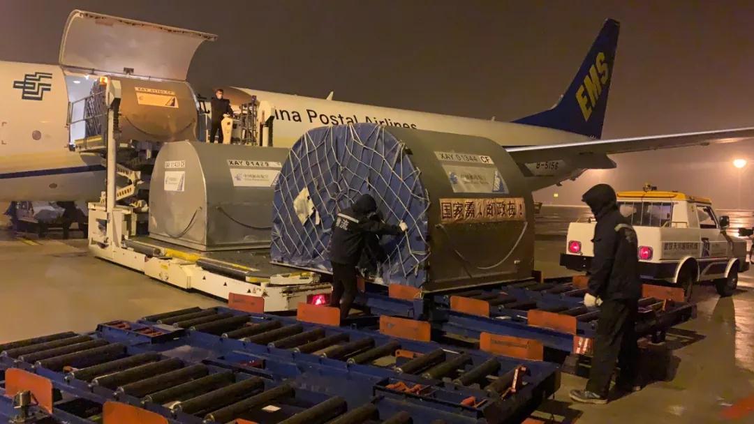 2月27日17時32分,中國郵政航空公司CF9121航班承載著總重1.618噸的16臺德國產ECMO設備及配套耗材從北京首都機場起飛,于19時16分在小雨中飛抵武漢天河機場,郵航武漢辦事處和天河機場地面保障部門第一時間展開卸機作業,完成這批救命設備的空陸交接。