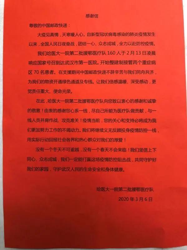 3月6日,哈醫大一院第二批援鄂醫療隊為免費寄遞個人物資服務向武漢郵政發來感謝信;3月11日,唐山、承德、張家口支援湖北醫療隊111名醫護人員通過“武漢交通”微信公眾號發表了“致敬郵政速遞人員”的文章,對武漢郵政的服務表示感謝。