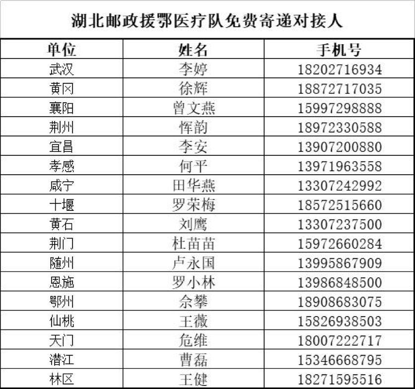 此次援鄂醫護人員個人物資免費寄遞由黃岡市郵政分公司在湖北省率先開展,為山東和湖南援鄂醫療隊免費收寄個人物資1200多件,受到了醫療隊員們的一致好評。而武漢作為此次全國疫情防控阻擊戰的重中之重,也是外省醫療隊援助的重點,醫療隊員個人物品寄遞需求也最為迫切。武漢市郵政分公司第一時間對外發布公告,凡駐武漢市行政轄區內的外省各級醫療服務隊員,均可通過聯系指定郵政工作人員的方式,由武漢市郵政分公司提供上門攬收服務,免費寄遞相關郵件。該分公司還成立了援鄂醫療隊個人物資免費寄遞專班,積極與市防疫指揮部聯系,宣傳開展免費寄遞服務。