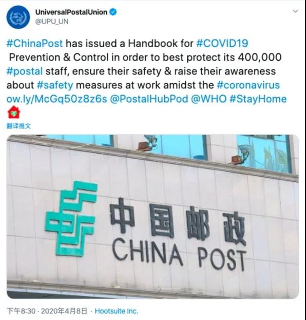 4月9日,萬國郵政聯(lián)盟在其官方社交媒體上發(fā)布了由中國郵政集團(tuán)有限公司制作的《新冠病毒防護(hù)指導(dǎo)手冊》英文版,向世界分享中國郵政的疫情防控經(jīng)驗。