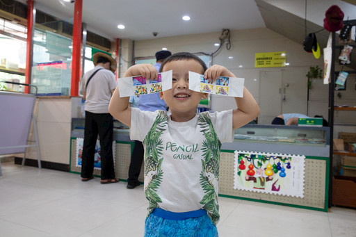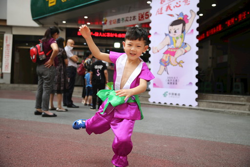 6月1日,重慶市沙坪壩區三峽廣場郵政支局門前,前來購買《動畫—葫蘆兄弟》郵票的小朋友和家長絡繹不絕,郵票上栩栩如生的葫蘆兄弟形象吸引了小朋友的目光。三峽廣場支局還特意為到場的小朋友準備了葫蘆兄弟同款服裝,供小朋友拍照留念。一位小朋友穿上葫蘆兄弟服裝后,在支局門前興奮地手舞足蹈。 □朱亞坤  攝影報道