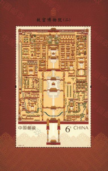 紫禁城建造技藝高超,內在考究精妙,外在磅礴大氣,代表著當時最高的建造水平。中央軸線上分布著三大殿(太和殿、中和殿以及保和殿)和后三宮(乾清宮、交泰殿以及坤寧宮),左右兩條次軸線上分別分布著慈壽宮、寧壽宮等宮殿。出于防御需要,宮殿建筑外圍筑有宮墻,四周分布有角樓,外有護城河環繞。故宮平面示意圖首次登上郵票,細膩、完整地呈現了故宮恢弘的建筑布局。