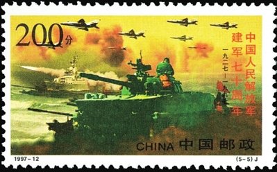 1997年8月1日,中國郵政發(fā)行了1997-12《中國人民解放軍建軍七十周年》紀念郵票1套5枚,票名分別是“陸軍”“海軍”“空軍”“戰(zhàn)略導彈部隊”和“陸海空聯(lián)合演習”5枚郵票,以陸、海、空和戰(zhàn)略導彈部隊的主戰(zhàn)兵器為主圖,背景是按兵種按時間有機串聯(lián)在一條主線上的建軍七十年來的重大事件,淡彩的背景與重彩的主圖珠聯(lián)璧合,能夠讓人自然重溫人民解放軍七十年的成長歷程,真切感受人民軍隊的現代化步伐。每幅畫面雖沒有出現一個軍人形象,但那隆隆開進的坦克、劈波斬浪的軍艦、呼嘯而過的戰(zhàn)機和騰空而起的導彈,創(chuàng)造了一種千軍萬馬奔騰向前的氣勢,表現出現代化戰(zhàn)爭操縱著現代武器與敵人決戰(zhàn)千里之外的新特點,收到了此處無人勝有人的藝術效果。