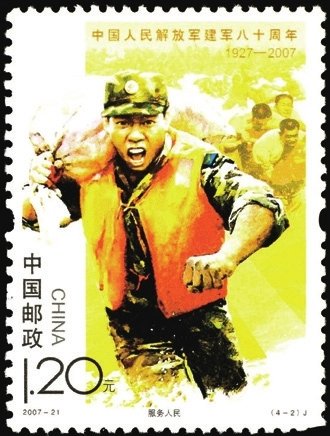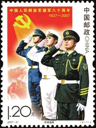 2007年8月1日發(fā)行2007-21《中國人民解放軍建軍八十周年》紀念郵票1套4枚,畫面生動表現了中國人民解放軍在黨的領導下,發(fā)揚聽黨指揮、服務人民、英勇善戰(zhàn)的優(yōu)良傳統(tǒng),刻苦訓練、抗洪搶險,參與聯(lián)合國維和行動,用忠誠和熱血捍衛(wèi)國家主權和安全,筑起共和國的鋼鐵長城,集中反映出軍隊建設的新成就和我軍忠實履行歷史使命的時代風采。