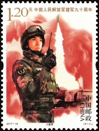 2017年8月1日中國郵政發(fā)行了2017-18《中國人民解放軍建軍九十周年》紀念郵票1套6枚,小型張1枚。圖案內容分別為:陸軍、海軍、空軍、火箭軍、戰(zhàn)略支援部隊、武裝警察部隊,小型張內容為聽黨指揮。該套郵票展現了中國人民解放軍的颯爽英姿和中國軍事作戰(zhàn)裝備的硬件實力,主題鮮明,磅礴大氣,畫面具有強烈的動感和威嚴的氣勢。小型張上軍旗飄揚,各軍種英姿颯爽,背景襯托各軍種高尖端裝備,描繪了我軍戰(zhàn)士聯(lián)合作戰(zhàn)的畫面,既表現了中國人民解放軍威武雄壯的軍容和現代化水平,也體現出黨的十八大以來,人民軍隊在新時代強軍目標指引下所取得的巨大成就。