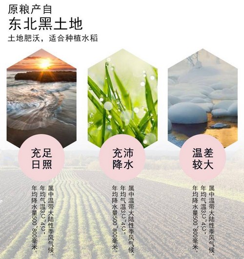 吉林地處北緯41-46°擁有肥沃的黑土地,長白山源頭水灌溉,是世界唯一“黃金水稻生產帶”。日照充足、水源優質、肥沃黑土、氣侯適宜孕育出中國最為優質的吉林大米。