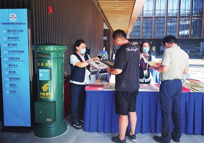 在文化服務專題展區,北京郵政商業信函局帶來了聲音明信片打印機,參觀者紛紛上前體驗,場面十分熱鬧?!安僮鞣浅7奖?,只需要掃碼選擇自己喜歡的照片作為明信片圖案,再按照提示進行錄音,就可以拿到一枚專屬的明信片?!眲偰玫铰曇裘餍牌膹埮颗d奮地告訴記者,這枚明信片上印有二維碼,只需掃碼就可以聽到剛剛錄制的聲音。