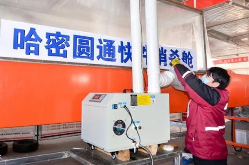 12月7日,哈密天順物流園內(nèi)的哈密圓通快遞公司分撥中心入口處,工作人員正在為消殺艙霧化機(jī)添加按規(guī)定配比的消毒液。記者李文龍攝