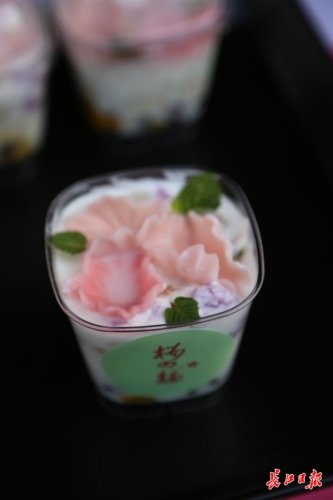 據(jù)了解,這種“櫻花面”,是用特殊模具生產(chǎn)的櫻花瓣形狀的面片。在現(xiàn)場,幾朵煮熟的櫻花面片,就像一朵朵粉色的櫻花,軟軟萌萌,很是可愛;與水果、芝士搭配,再點綴幾片新鮮薄荷,這樣的日系美食很受女孩喜歡。