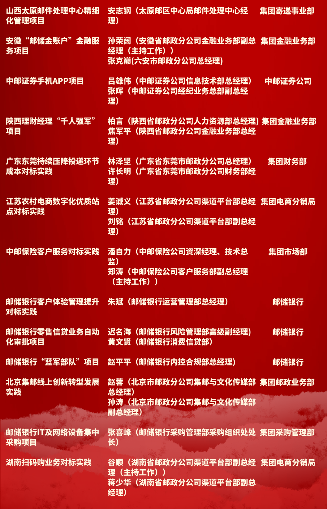 會(huì)議明確了2021年勞動(dòng)競(jìng)賽項(xiàng)目?jī)?nèi)容和要求。2021年,集團(tuán)公司勞動(dòng)競(jìng)賽將堅(jiān)持問題導(dǎo)向、目標(biāo)導(dǎo)向的競(jìng)賽原則,緊密圍繞打造“六維共生”的新郵政發(fā)展格局,堅(jiān)持以改革創(chuàng)新為動(dòng)力,以推動(dòng)中國郵政高質(zhì)量發(fā)展為主線,聚焦集團(tuán)公司年度工作會(huì)議確定的發(fā)展目標(biāo)、重點(diǎn)工作和重點(diǎn)項(xiàng)目,針對(duì)各項(xiàng)業(yè)務(wù)的發(fā)展重點(diǎn)、難點(diǎn)及薄弱環(huán)節(jié),共確定競(jìng)賽項(xiàng)目17個(gè),包括16個(gè)業(yè)務(wù)競(jìng)賽項(xiàng)目和“對(duì)標(biāo)先進(jìn)最佳實(shí)踐獎(jiǎng)”綜合性項(xiàng)目。
