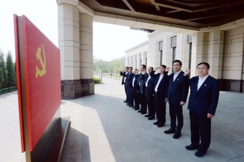 “我志愿加入中國(guó)共產(chǎn)黨,擁護(hù)黨的綱領(lǐng),遵守黨的章程,履行黨員義務(wù),執(zhí)行黨的決定……”在紀(jì)念館二層的“四梁八柱”敞軒,集團(tuán)公司黨組全體同志在黨旗前莊嚴(yán)宣誓,重溫入黨誓詞,重憶入黨初心,堅(jiān)定為黨和人民奮斗終身的理想信念。