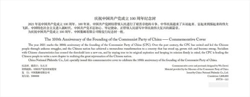 2021年6月29日,《中國共產黨成立100周年》紀念郵票和紀念封在中國共產黨歷史展覽館隆重發布。中共中央宣傳部副部長蔣建國,國家郵政局黨組書記、局長馬軍勝,中國郵政集團有限公司黨組書記、董事長劉愛力出席發布儀式并為《中國共產黨成立100周年》紀念郵票揭幕,國家郵政局黨組成員、副局長戴應軍,中國共產黨歷史展覽館館長吳向東,中國郵政集團有限公司黨組成員、副總經理康寧為《慶祝中國共產黨成立100周年》紀念封揭幕。中國郵政集團有限公司黨組成員、副總經理王儉主持。