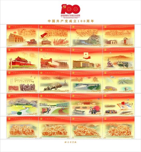 《中國共產黨成立100周年》紀念郵票是建黨周年系列郵票中發行枚數最多、表現內容最廣、發行規格最高的一套。全套郵票以中國共產黨波瀾壯闊的百年征程為主線,分別從新民主主義革命時期、社會主義革命和建設時期、改革開放和社會主義現代化建設新時期和中國特色社會主義新時代,以及綜合性內容加以表現,體現了一代又一代中國共產黨人頑強拼搏、不懈奮斗的成果,講述了中國共產黨一百年來為人民謀幸福、為民族謀復興的奮斗歷程。