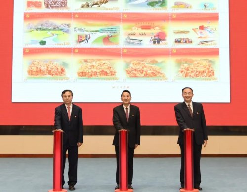 蔣建國(中)、馬軍勝(右)、劉愛力共同為《中國共產黨成立100周年》紀念郵票揭幕