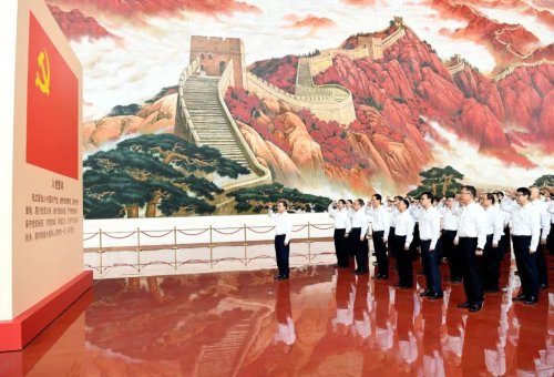 朝陽映紅了神州大地,長城如同東方巨龍般起伏在崇山峻嶺之巔。在黨史館序廳,劉愛力帶領集團公司全體參觀人員肅立在超大漆壁畫《長城頌》前,面向鮮紅的黨旗,高舉右拳重溫入黨誓詞。鏗鏘有力的宣誓聲響徹大廳,表達的是郵政人對黨的無限忠誠和為共產主義奮斗終身的堅定信仰。