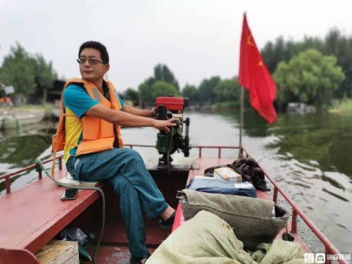 上午10點半,已經被汗水濕透衣服的王少朋回到了丁樓村碼頭。簡單和碼頭上的村民寒暄兩句,甚至都來不及坐下喝口水,王少朋就收起船錨出發了。因為時間不容許他耽擱太久,接下來的四個村子,全都在水上,龔莊和柳溝相距較近,但是王蘇白和建閘距離較遠,從王蘇白村到建閘村,要在湖上航行整整一個半小時。