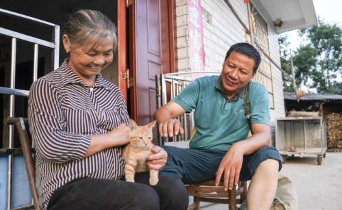 9月28日,雙峰郵政所的郵遞員吳文清(右)為村民派送一只貓咪。這名獨居的村民此前委托吳文清為她選購一只寵物貓作伴。