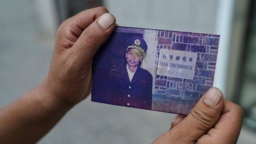 10月6日,雙峰郵政所的郵遞員吳文清展示當年父親身穿郵遞員制服的照片。