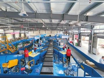 江安縣客運(yùn)中心一隅,是剛建成的江安縣農(nóng)村物流中心,近6000平方米的空間中設(shè)置了郵政處理、盒馬集市、全自動分揀中心、京東順豐快遞分撥等功能區(qū),標(biāo)著“金通工程”字樣的車輛進(jìn)進(jìn)出出。