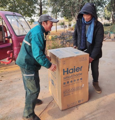 熊桂林為燎原村陳屋基灣村民陳志強(qiáng)老人送去網(wǎng)購(gòu)的熱水器。
