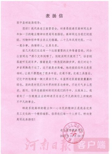 投遞是個特殊的崗位,長年累月奔波在大街小巷,工作時間最長,服務半徑最廣,但當一份洋溢著贊揚和肯定的表揚信送到高祥手中時,這個嚴寒酷暑、風霜雪雨都沒有喊過一聲苦,說過一聲累的男同志還是笑的很樸實,聽到街道上的“老客戶們”對他的肯定和認可時,他說,他的辛苦和勞累都“值了”。