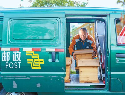 在浙江省湖州市長興縣,林城鎮(zhèn)郵政所蜂產(chǎn)業(yè)專職投遞員王國慶把要寄遞的蜂箱搬上快遞車。 許斌華攝(影像中國)