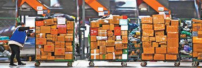 中國郵政集團(tuán)有限公司河南省鄭州郵區(qū)中心,工作人員在轉(zhuǎn)移快遞包裹。新華社記者 張浩然攝