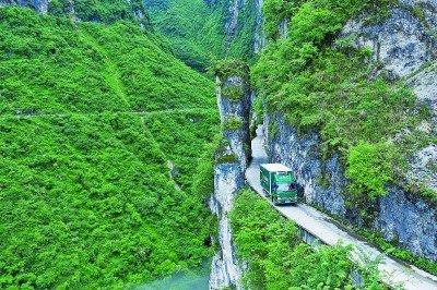 郵車行進在大渡河大峽谷入口的懸崖絕壁之上。 新華社發